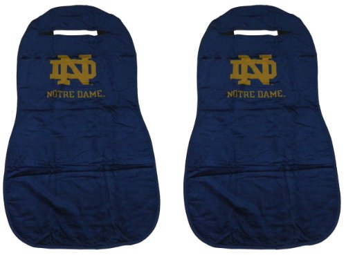 Go Notre Dame! These officially licensed Notre Dame University seat cover towels quickly and easily slip over the headrest on your front seat and the generous 57" x 28" size easily covers most bucket seats. Add a bit of personality and show off your school spirit while protecting your front bucket seats from stains, odors and perspiration. The rich gold 'ND' will show off your Irish pride against an attractive navy blue background. Seat towels are a stylish and practical way to keep your car or truck seats protected from dirt, spills and pet hair. Use it while tailgating, after a trip to the gym or the beach, after playing sports, or any time you want to protect your front seats. These inexpensive seat covers can be easily be removed when not needed and are machine washable. Two seat towel set.