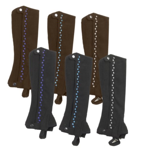Soft Arama half chaps with stretch ribbed panel, covered zipper, and snap closures at top and bottom. Features fun stars embroidery down the side. Free coordinating coil purse with purchase!