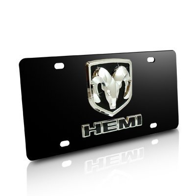 Dodge HEMI Logo on Black Steel Auto License Plate Description