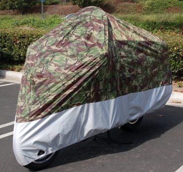 Built to survive the urban jungle, heavy duty cover for your motorcycle. Waterproof, heavy duty 300 Denier CAMO WEATHERGUARD Polyester with UV treating. All seams are double top stitched with nylon thread Heat resistant THERMO GUARD Nylon on lower areas. Cloth chamois on windsheild and fuel tank areas resist scratches. Flow through ventilation prevents condensation. Large, heavy duty grommets at center and front wheel for locking cover with bike. Includes matching duffel for easy storage and travel.