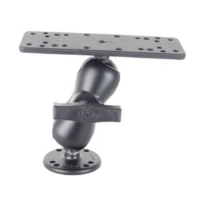 The RAM-111U-B, powder coated marine grade aluminum mount, consists of a SHORT double socket arm mount, one 2.5 In diameter round base with 1.5 In rubber ball and flat 6.25 In x 2 In rectangular plate. The plate contains different combinations of pre-drilled hole